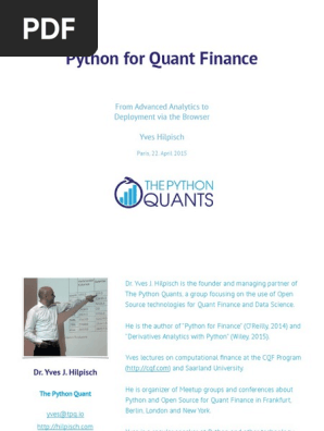 The same source code archive can also be used to build the windows and mac versions and is the starting point for ports to all other platforms. The financial industry has recently adopted python at a tremendous rate with some of the largest investment banks and hedge funds using it to build core trading and risk management systems. Download the latest python 3 and python 2 source. Mastering data driven finance 2nd edition read download by yves hilpisch python for finance.