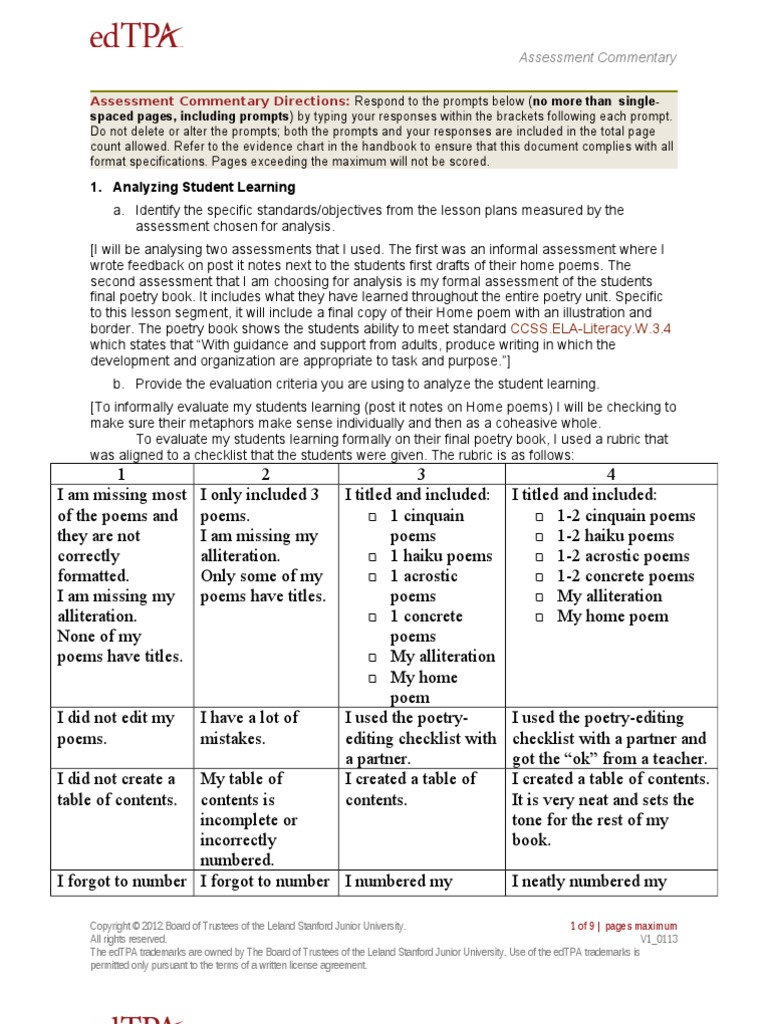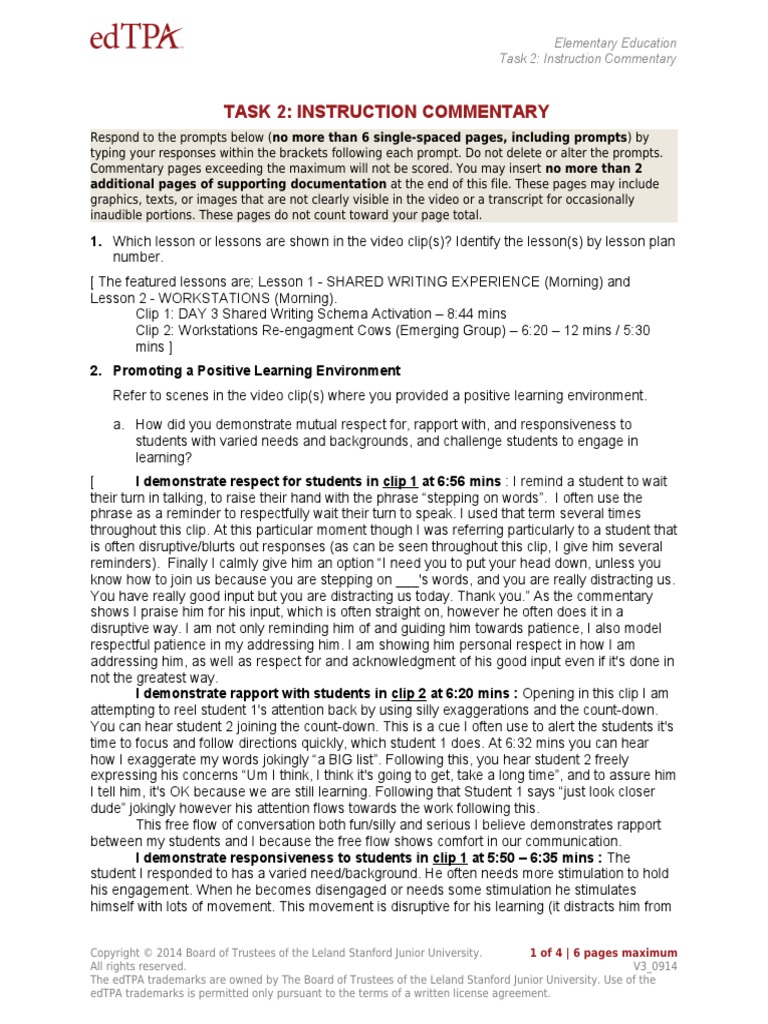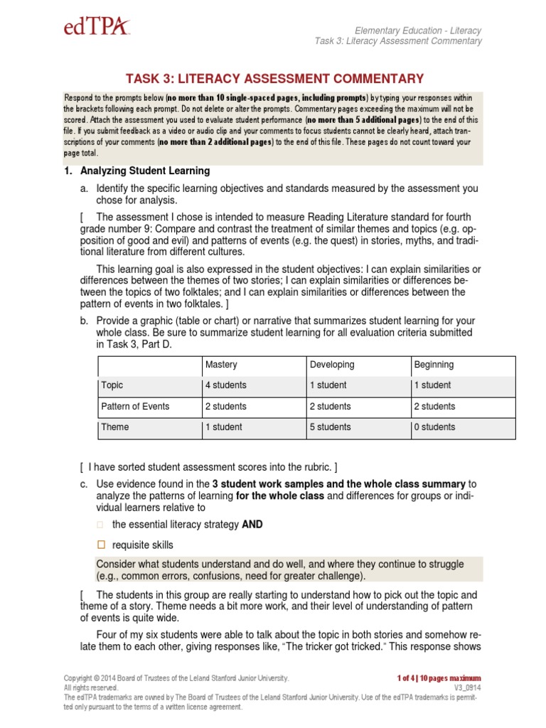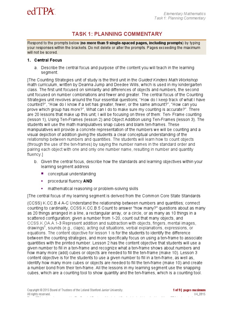 Edtpa math commentary for tasks 1 2 3 with video pdf. This is an 80 page portfolio of tasks 1 3 with commentaries additional materials and. Acquiring a complete understanding of the evidence that you need to submit in tasks 2 and 3 will help guide you as you plan the learning segment for planning task 1. The edtpa trademarks are owned by the board of trustees of the leland stanford junior university. However the profile also demonstrates that the candidate struggles with academic language rubrics 4 and 14 and being able to reflect on knowledge of students rubric 3 and using evidencedata to inform teaching rubrics 10 and 15.