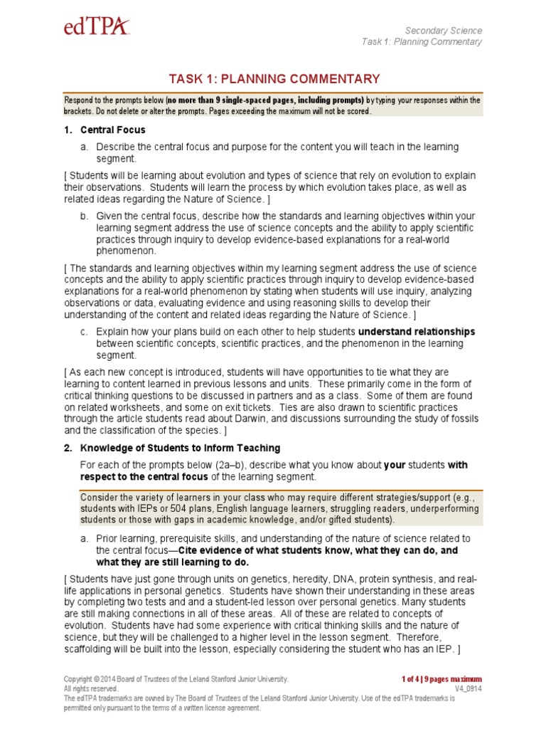 Acquiring a complete understanding of the evidence that you need to submit in tasks 2 and 3 will help guide you as you plan the learning segment for planning task 1. Instruction commentary respond to the prompts below no more than 6 single spaced pages including prompts by typing your responses within the.