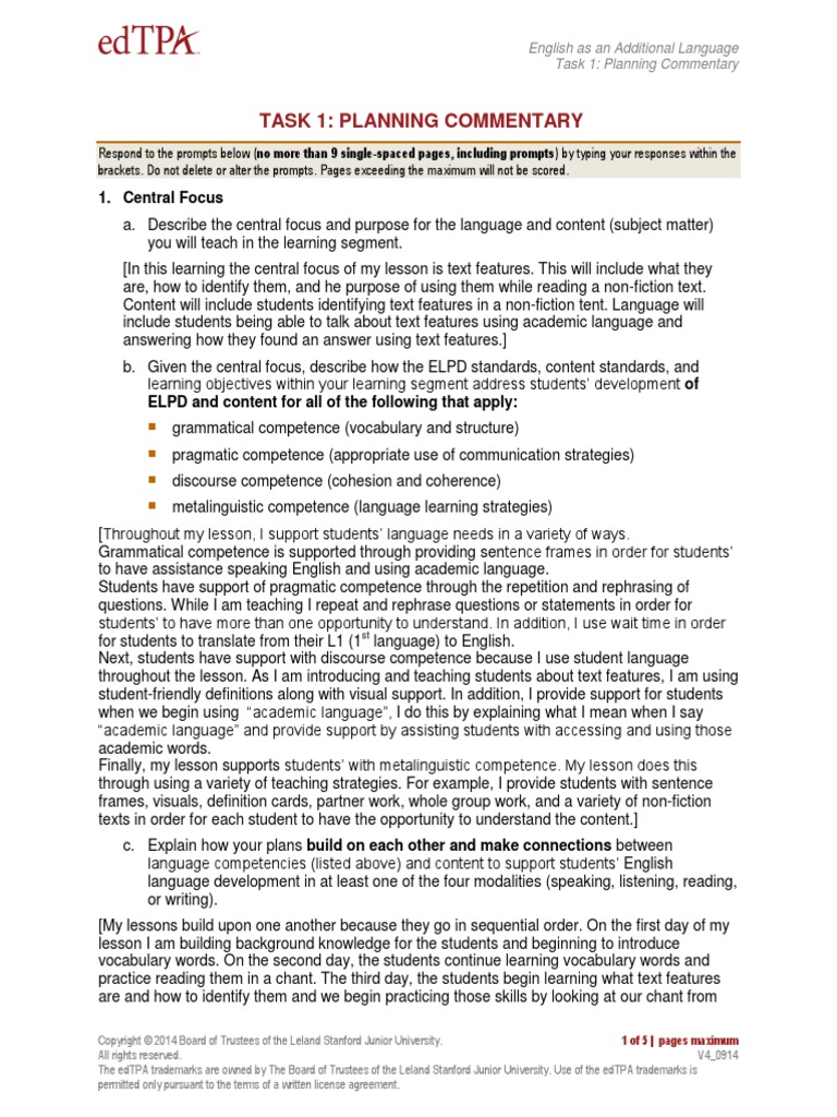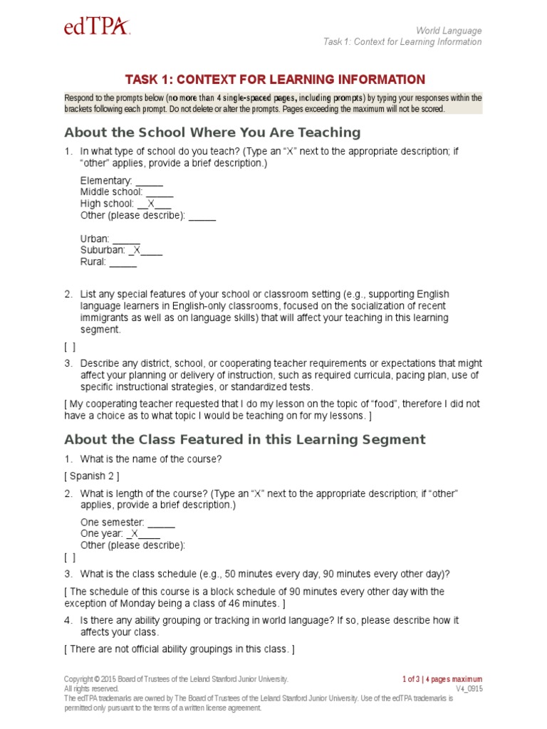 Edtpa task 2 world languages pdf. Understanding rubric level progressions is a key resource that is designed to describe the meaning behind the rubrics. Instructing and engaging students in learning. The following portfolio in secondary english language arts shared with permission of the author earned scores of five across every rubric all 15 for a perfect score of 75 points in washington state there are three additional rubrics covering student reflection and the portfolio author earned a score. The edtpa trademarks are owned by the board of trustees of the leland stanford junior university.